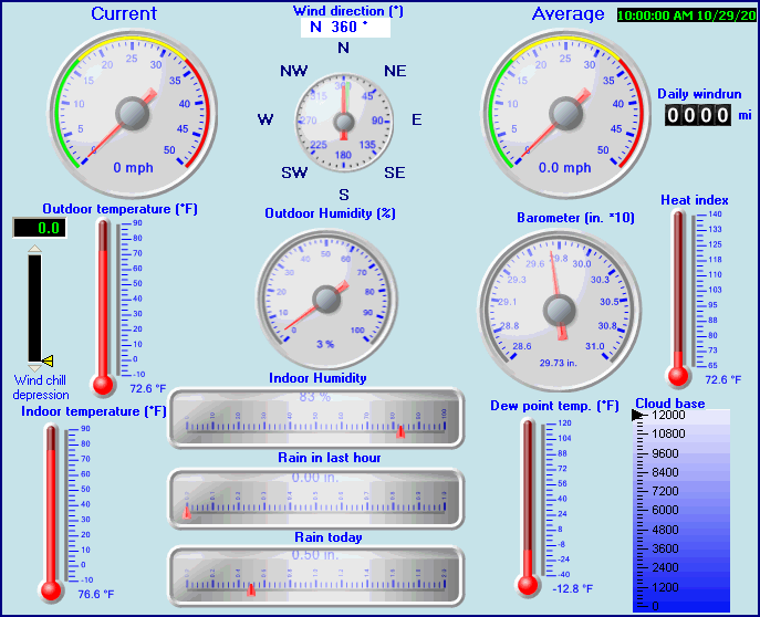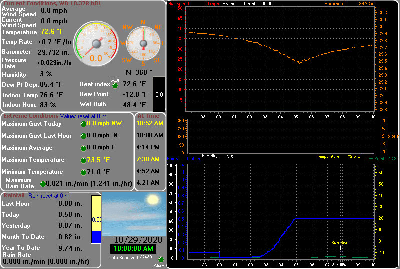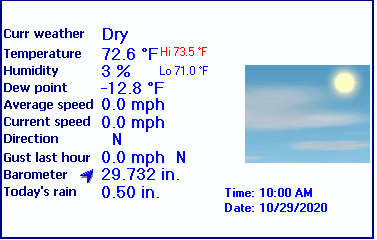 | Heat Index | 72.6°F | Maximum Gust (last hour) | 0 mph at: 10:00 AM |