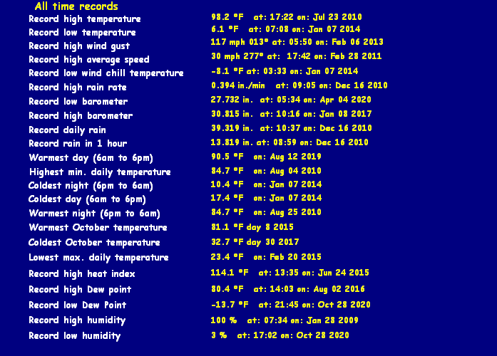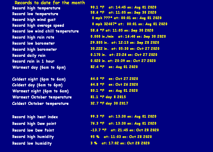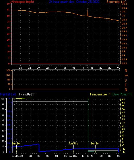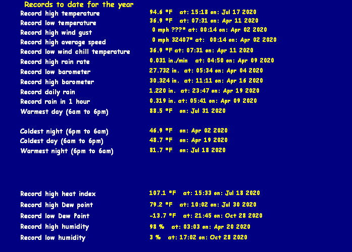 | Maximum Gust (since midnight) | 0 mph at: 10:52 AM | Maximum 1 minute average (since midnight) | 0.0 mph at: 4:14 PM |