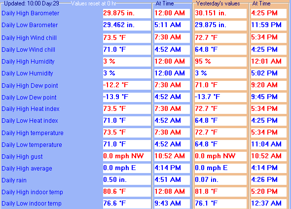| Rainfall (last hour) | 0.00 in. (0.0 mm) | Rainfall (since midnight) | 0.50 in. (12.7 mm) at 4:51 AM |