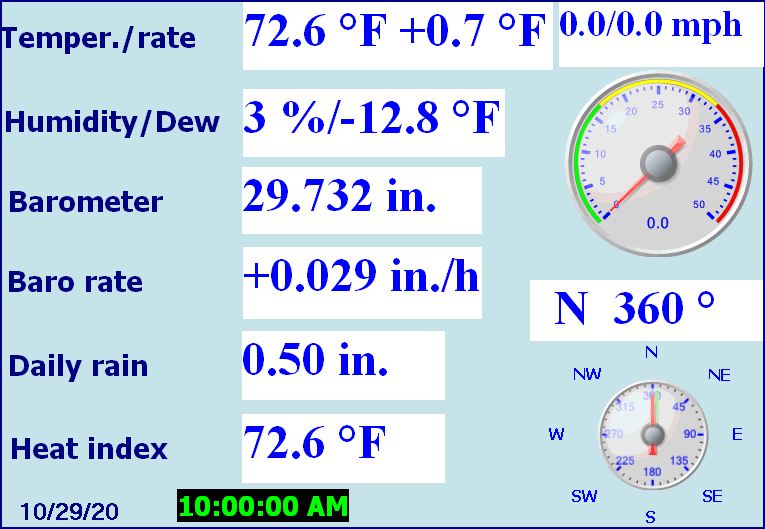 | LAST READING AT TIME: 10:00 AM DATE: October 29 2020, time of next update: 10:05 am | |||
